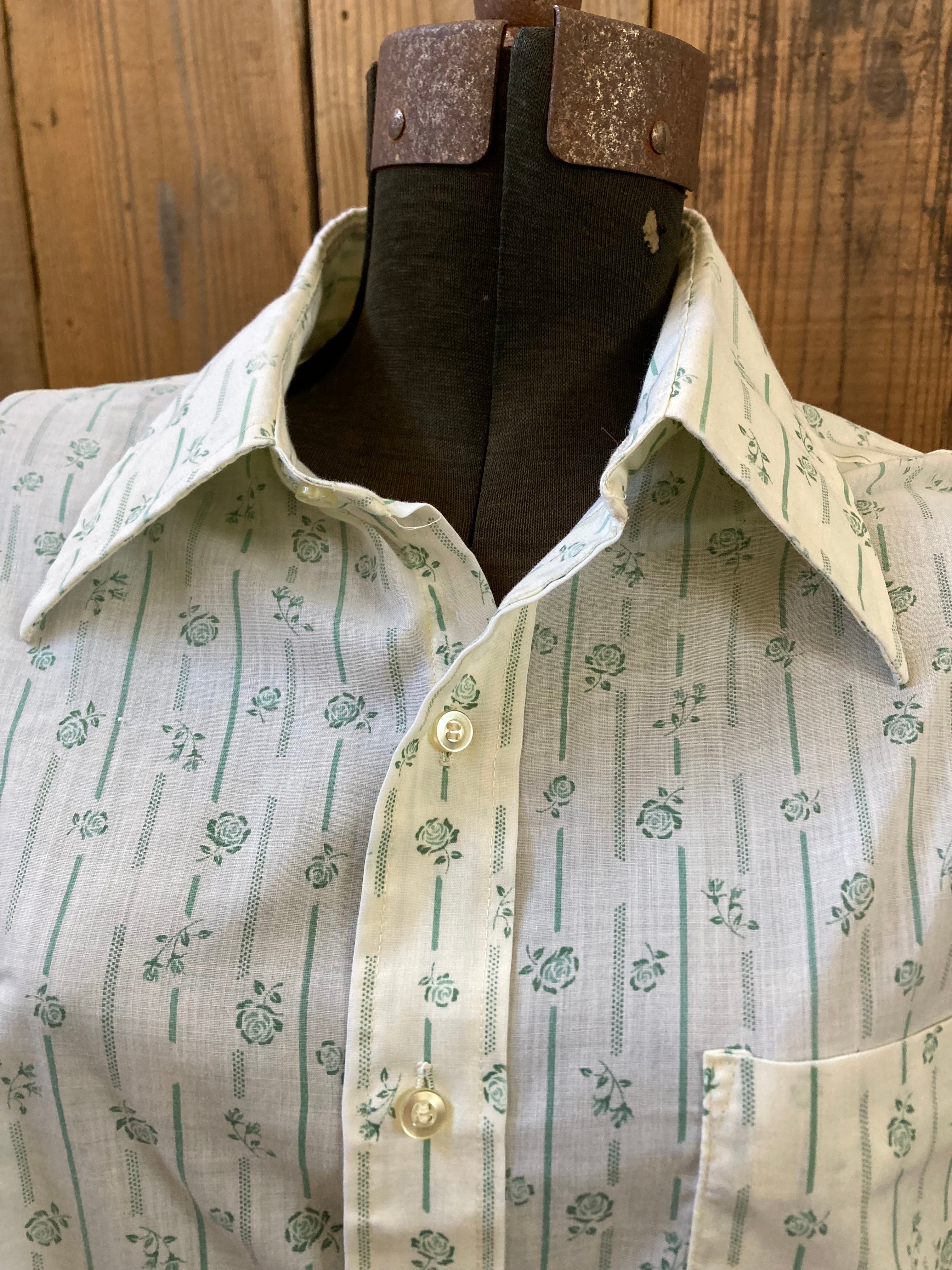 グリーンの小さめローズのデザインとストライプ調のデザインの入った、爽やかな柔らかなイメージのシャツです。